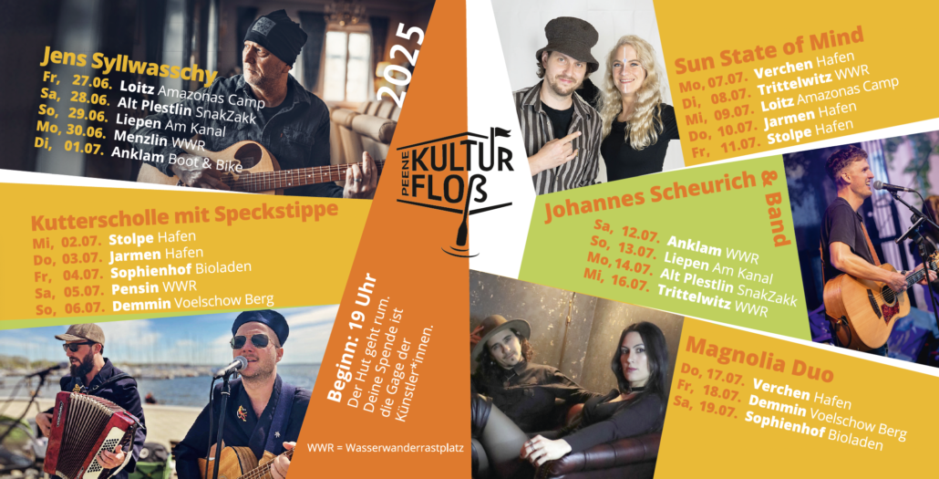 Das Kulturfloß Peene ist in die Saison 2025 gestartet. Vom 27.06.2025 bis 19.07.2025 fährt das Floß wieder zwischen Verchen und Anklam und bringt überall dort Musik hin, wo sonst sonst Biber und Kranich gute Nacht sagen. Fünf wunderbare KünstlerInnen übernehmen in der Zeit das Steuer und spielen an 12 Spielorten 22 Konzerte. Beginn ist immer um 19 Uhr. Freut euch auf tolle Unterhaltung und gute Verpflegung. Folgende KünstlerInnen sind mit an Bord: Jens Syllwasschy, Kutterscholle mit Speckstippe, Sun state of Mind; Johannes Scheurich, und das Magnolia Duo.