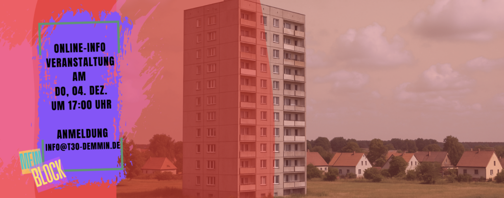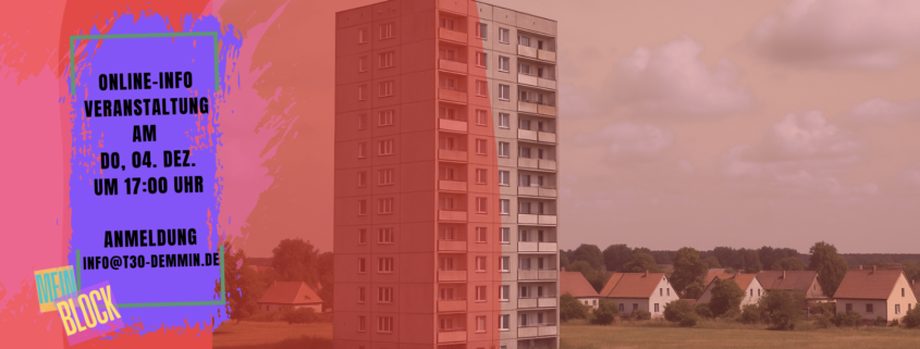 Eine Online-Info Veranstaltung findet am Do, den 04.12.2025 um 17:00 Uhr online statt. Melden sie sich gerne unter info@t30-demmin.de an.